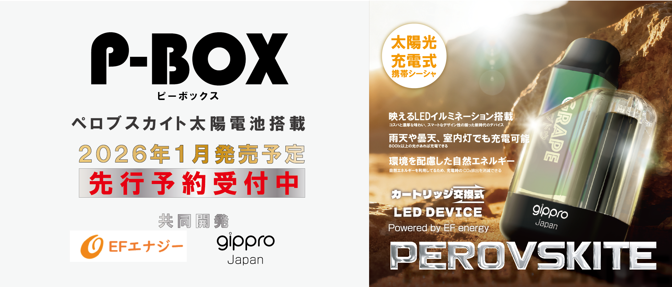 電子タバコ「P-BOX」は、太陽光発電事業を営むEFエナジー社が調達するペロブスカイト太陽電池を使用した自然エネルギーで充電ができる新たな形の電子タバコです。日光や室内照明からエネルギーを取り込み、バッテリーを自動的に補充することが可能です。これにより、「頻繁な充電が必要」「廃棄バッテリーの増加」といった従来の電子タバコが抱える課題を解消し、電力消費の削減と環境負荷の低減を実現します。環境に配慮した次世代の電子タバコとして、持続可能な社会への貢献を目指しています。